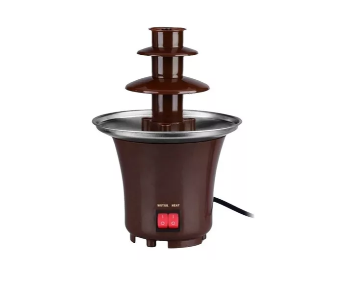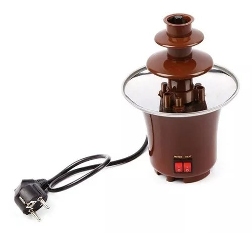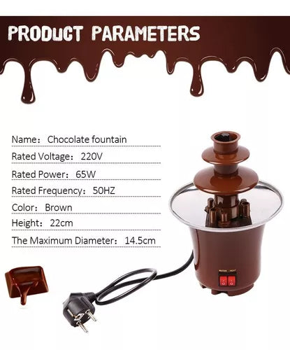 Lleva el chocolate desde la base hasta la parte superior de la torre donde cae por cada piso, por su tamaño compacto es ideal para poner sobre la mesa.