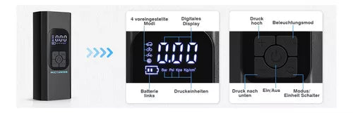 * Inflador automático de neumáticos inalámbrico: este compresor de aire portátil tiene cuatro unidades de presión: PSI, KPA, BAR y KG/CM2, y funciona de 0 a 150 PSI.