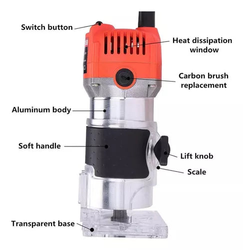 Esta recortadora eléctrica es ampliamente utilizada en el procesamiento de madera, procesamiento de gabinetes, producción artesanal y bricolaje. Facilita el recorte de la madera y el ranurado; el diseño de la base transparente es ideal para lograr una precisión fácilmente reconocible en el procesamiento. La báscula es claramente visible y fácil de operar. Con este recortador eléctrico, el trabajo en carpintería es más suave.
