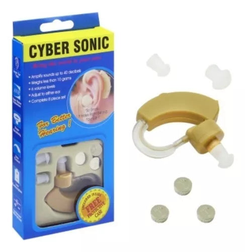 El micrófono de condensador de alta sensibilidad incorporado garantiza una captación de sonido precisa. El paquete incluye 1 unidad amplificadora Cyber Sonic, 3 adaptadores de diferentes tamaños para los oídos, 2 pilas y un estuche para almacenamiento. Este modelo, denominado "Ear", es una opción confiable y eficiente para mejorar la audición.