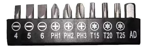 * 10 Puntas de destornillador (4mm, 5mm, 6mm, PH1, PH2, PH3, T10, T20, AD).