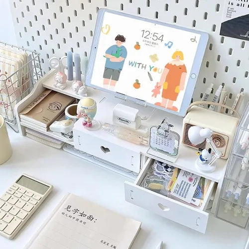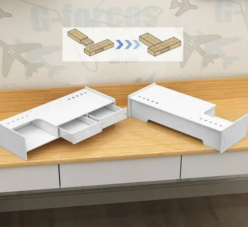 SOPORTE ELEVADOR PARA MONITOR SOBRE MESA ORGANIZADOR ARMABLE CON 2 GAVETAS