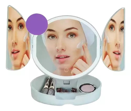 ESPEJO TOCADOR TRIPLE CON COMPARTIMIENTOS AUMENTO 5X LUZ LED TRI FOLD LIGHTED TRIPLE ILUMINADO