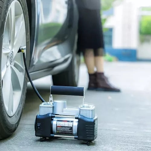 Mini compresor de aire doble cilindro diseñado para inflar neumáticos de grandes camiones, 4x4, vehículos recreativos, coches y otros inflables. Cuenta con un motor de accionamiento directo y funciona con un voltaje de 12V.