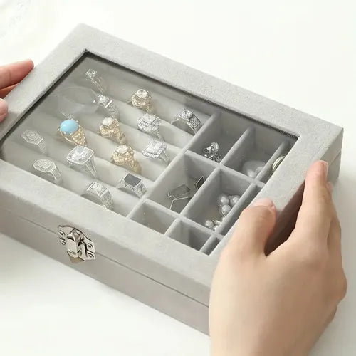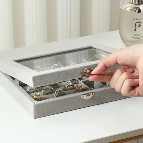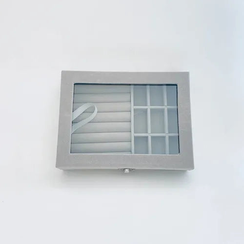 * Materiales de alta calidad: compuesto de tablero compuesto duradero, envuelto en tela de terciopelo, suave y cómodo. La cubierta de vidrio puede proteger sus joyas y objetos, y el compartimento ajustable puede almacenar muchos tamaños diferentes de joyas.