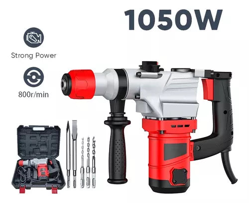 Este Rotomartillo Rotary Hammer 26 mm 2900rpm Perforador Cincelador de color rojo/negro es un potente demoledor industrial de 1050 watts de par, que brinda una potencia de impacto de 15 joules permanentes para un rendimiento excepcional, maniobrabilidad y golpe. Es perfecto para tareas profesionales de uso exigente, en obra y en cualquier situación de alto rendimiento.