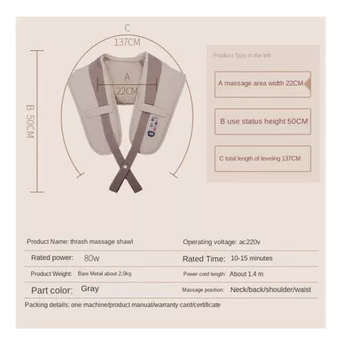 Su diseño proporciona puntos de contacto dirigidos en su cuello y parte posterior, proporcionando así un gran alcance que penetra profundamente en las capas del músculo y proporciona un calmante eficaz para su cuerpo. El mantón de masaje cervical con su poderoso masaje con percusión libera el estrés y la tensión para rejuvenecer, revitalizar y energizar. Puede ser aplicado también en sus glúteos y muslos.