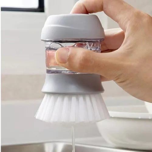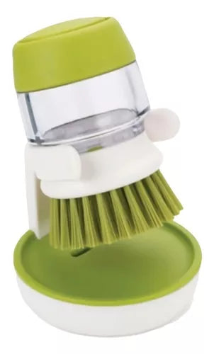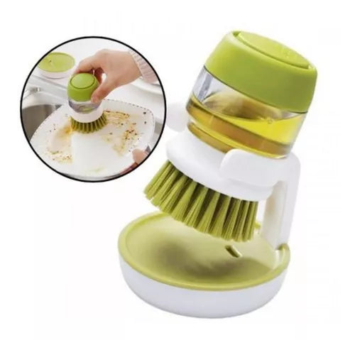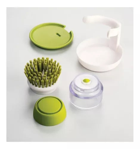 Cepillo para fregar con cerdas que no rayan, ideal para ollas, sartenes y platos. Simplemente presione el botón para soltar el liquido de lavado. Soporte de almacenamiento resistente. El sistema permite que el cepillo se seque por goteo de forma natural. Para un mejor cuidado de tu piel y tus manos en el uso diario al lavar.