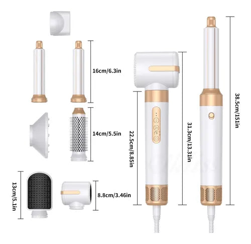 Secador y moldeador de cabello 7 en 1, que es una herramienta de peinado multiusos. Secador de Pelo 7 en 1 cuenta con un potente motor de 1400W de cerámica y ABS, asegurando un secado eficiente con control de tres velocidades. Su cable giratorio de 360 grados mejora la usabilidad al estilo de salón, mientras que la función iónica promueve un cabello más saludable. Certificado por su seguridad y rendimiento, soporta funciones de peinado versátiles, incluyendo el alisado y el cepillado.
