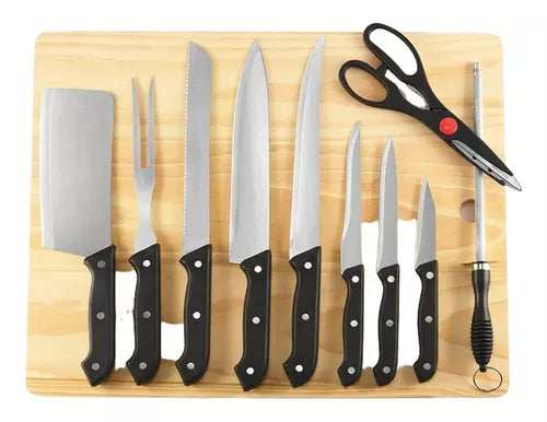 SET DE CUCHILLOS TABLA PARA PICAR TIJERA AFILADOR PARRILLERO 11 PIEZAS