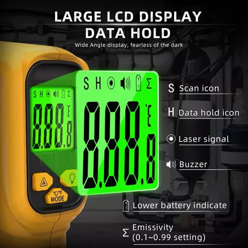 * Termómetro infrarrojo de alta precisión: está hecho de material ABS, resistente a las caídas, más cómodo de agarrar, fácil de operar y versátil. Pantalla LCD retroiluminada de gran tamaño, resistente a los cambios ambientales externos, fácil de leer el valor. Con pantalla de estado de escaneo de prueba S, indicador de pitido, indicador de batería baja, retención de datos, luz láser de encendido/apagado y funciones de conmutación libre de grados Celsius/°F.