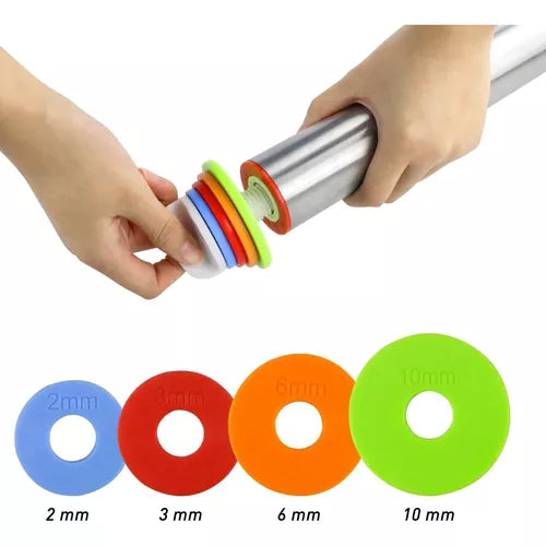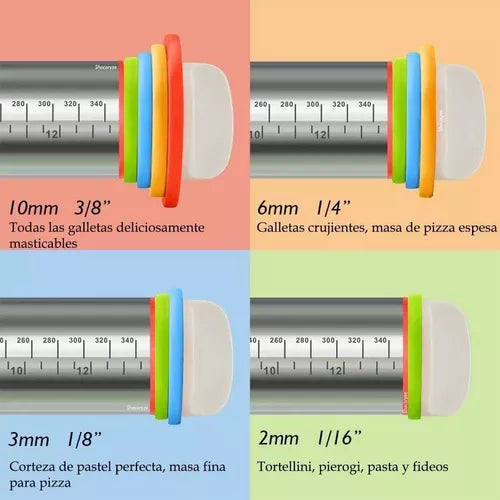 * Para crear la masa que desee: las mediciones en el rodillo le permiten enrollar la masa al tamaño que necesite. Además, 4 anillos extraíbles de grosor ajustable (2 mm / 4 mm / 6 mm / 10 mm) lo ayudan a crear cualquier masa de grosor deseado, sin importar qué pasteles desee, como pan, fondant, pizza, galletas y pastel.